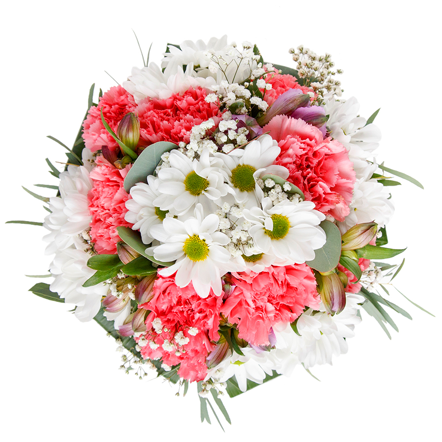 The combination of white chrysanthemums and pink carnations was exquisite. Truly a charming bouquet.
