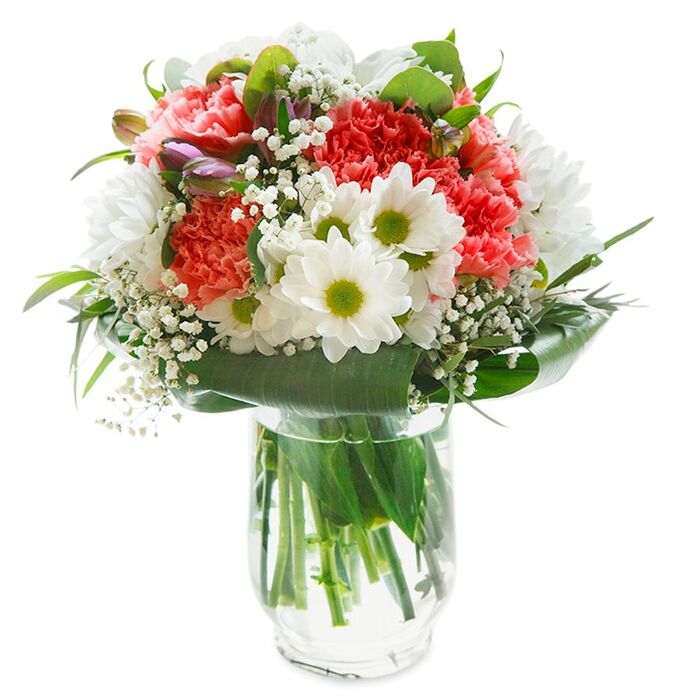 Share the radiance of fresh flowers with our stunning bouquet. Featuring a unique combination of snow-white chrysanthemums, light pink carnations, and airy gypsophila, all beautifully arranged with vibrant aspidistra leaves.